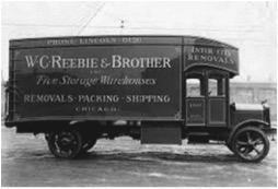 Bill began his company with a helper and a two-handled cart. Most of his clients lived in walk‐ups and Bill and his worker carried pianos up the flights of two-, three- and four-story buildings. The headquarters of W.C. Reebie & Bro. included a series of buildings in the 2500 block of North Sheffield Avenue. Building billboards called Reebie the “largest van company in the world.” Bill was joined by his brother John. The 1885 street directory was the first listing for the W.C. Reebie & Brother express company, then located at 2533 N. Sheffield Avenue.