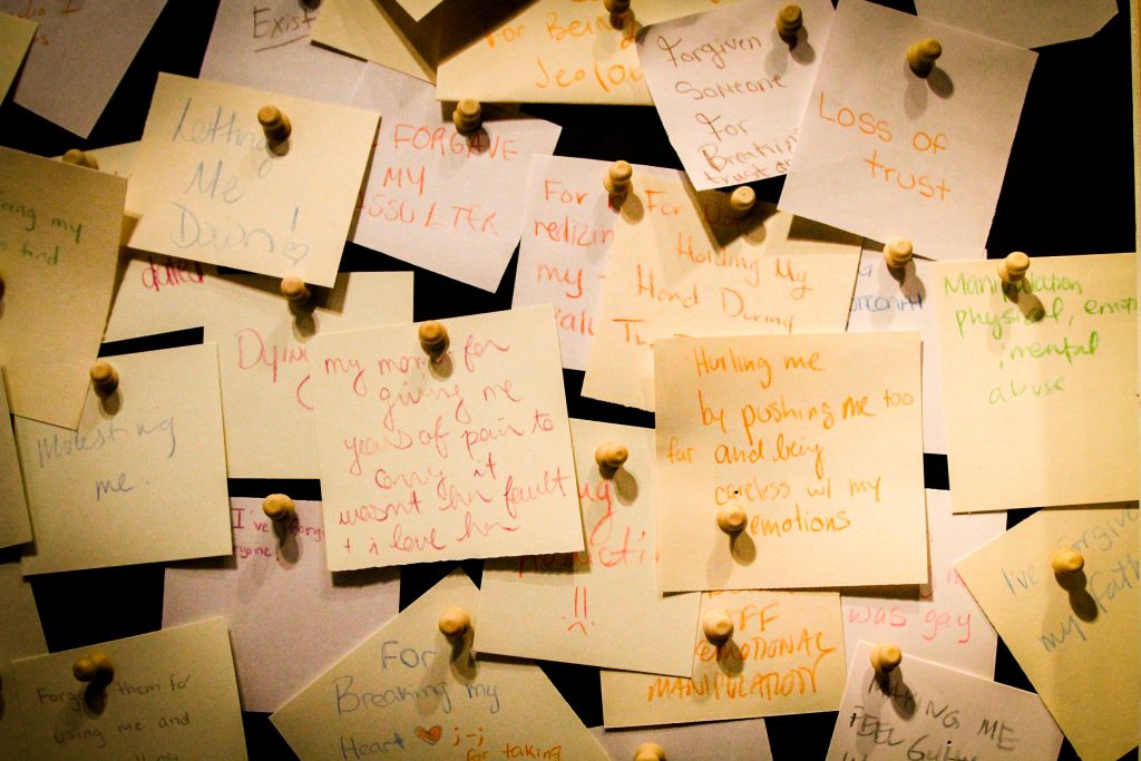 As new moments of forgiveness were tacked to the wall, each isolated piece of white paper and colored pencil became part of the coherent whole, a wall of forgiveness. For many, contributing to and experiencing this installation was deeply moving.