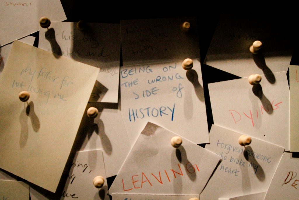 We hope you were able to join us during the run of Cardboard Piano to experience the lobby display firsthand, but if you missed it, fear not! Read on to check out the lobby installations on Love, Faith, and Forgiveness, and read some of the audience responses collected throughout the play’s 10-week run.