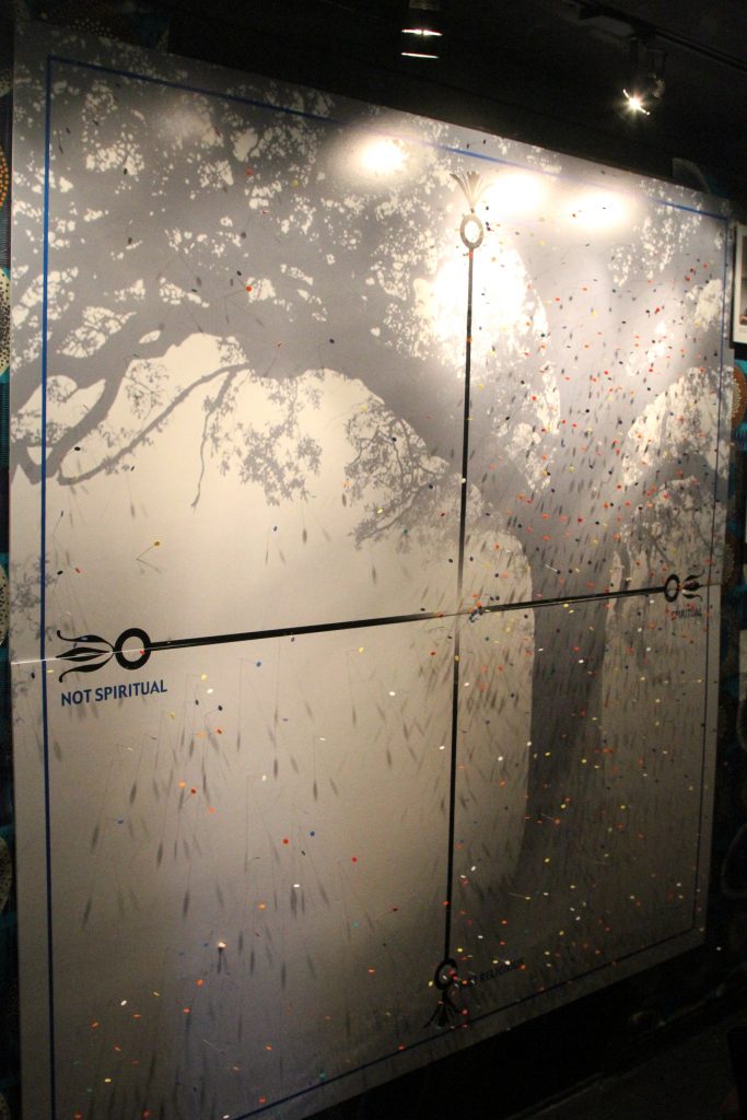 As part of our lobby display, we asked folks to reflect on how religion informed their selves. On a matrix of “Spiritual” to “Not Spiritual” and “Religious” to “Not Religious,” audience members were instructed to place a pin where they personally identified.