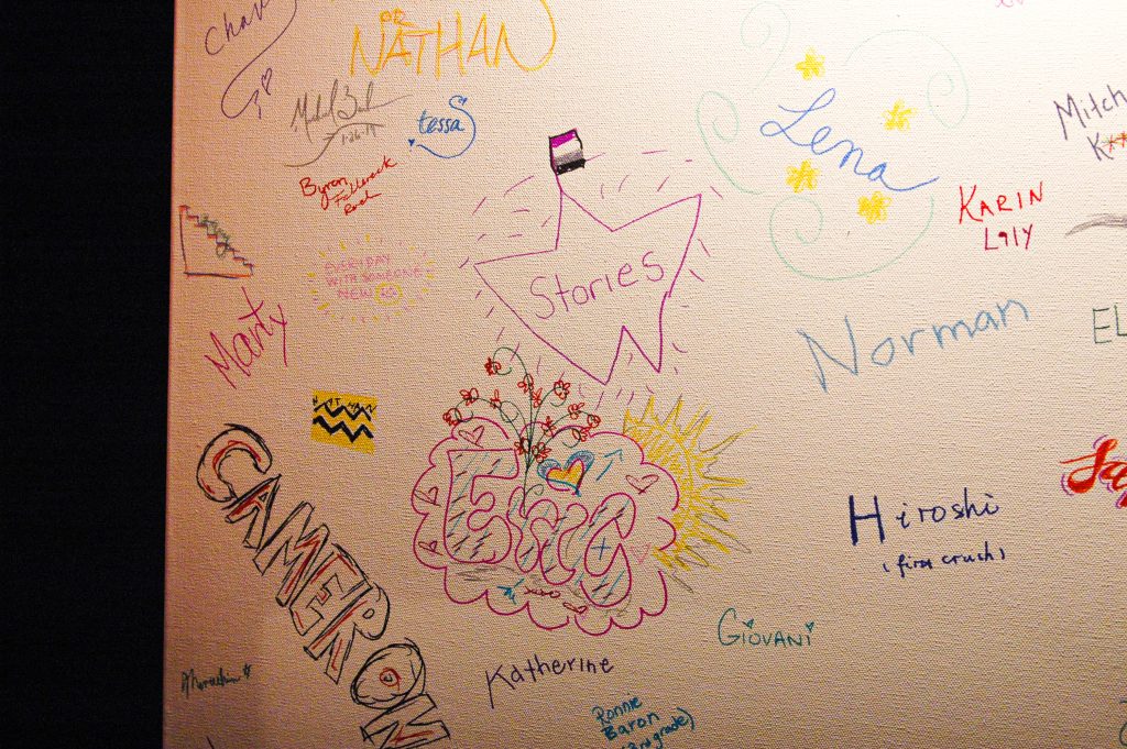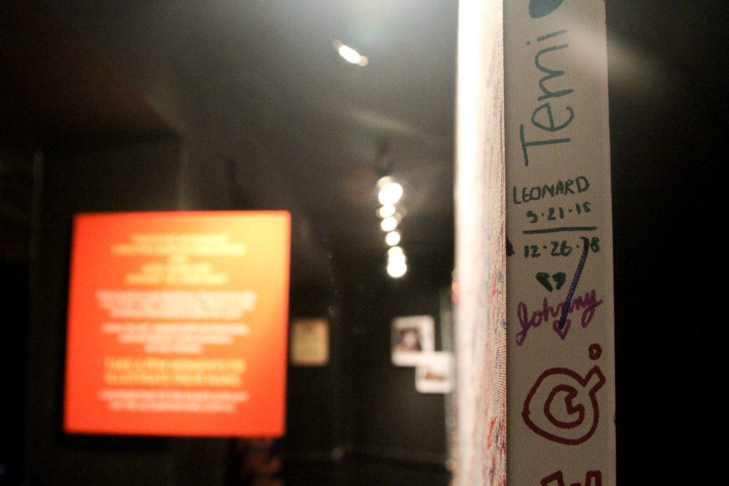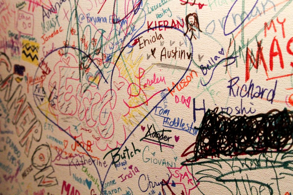 Ahh, first love. Those painful, exhilarating, transcendent moments when we realize our lives are more complete with someone or something else in them. We asked our audiences to think back on their memories of those loves, and then illustrate those names and emotions as part of a collaborative art piece. They enthusiastically obliged: