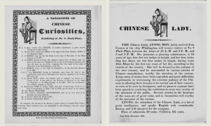 Nathaniel and Francis Carnes brought Afong Moy to America on a two-year contract, to help market Chinese export goods as exotic. She was promoted as a beauty from an exceptional place, and presented as a “Chinese curiosity.” The Carnes brothers, in particular, highlighted to the public her visual differences—her bound feet, her native clothing, and accessories. In this period, Afong Moy went on tour throughout the mid-Atlantic, New England, the South, Cuba, and up the Mississippi River.