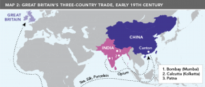 In 1757, Emperor Qianlong of China adopted a highly restrictive policy regarding the movement of Westerners in China, making the south port of Guangzhou the only port where foreign trade was allowed. Great Britain had been buying increasing quantities of tea from China, but it had few products that China was interested in buying by way of exchange, especially after the Emperor Qianlong’s restrictive policy. In response to the trade deficit, the British merchants, who were in control of India’s foreign trade and with the financing of this trade centered in London, developed a three-way exchange: the tea Britain bought in China was paid for by India’s exports of opium and cotton to China. As the demand for tea rapidly increased in England, British merchants actively fostered the profitable exports of opium and cotton from India. In the year 1820, the opium trade grew dramatically.