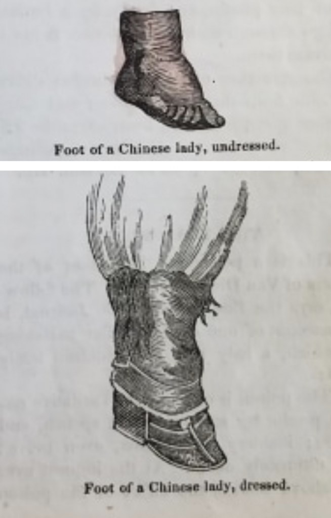Seventeen-year-old Margaret Gibson visited Afong Moy in Baltimore. In her letter to her older brother John, she wrote about her immediate feelings seeing her bound feet: “I had heard so much of her feet being disgusting, that when I did see her, I was much surprised—Could I divest myself of the idea of its being contrary to nature, I should think them beautiful, she placed them very prettily on the ground, and although she totters, and seems pained by walking, I cannot think the appearance disgusting.”
