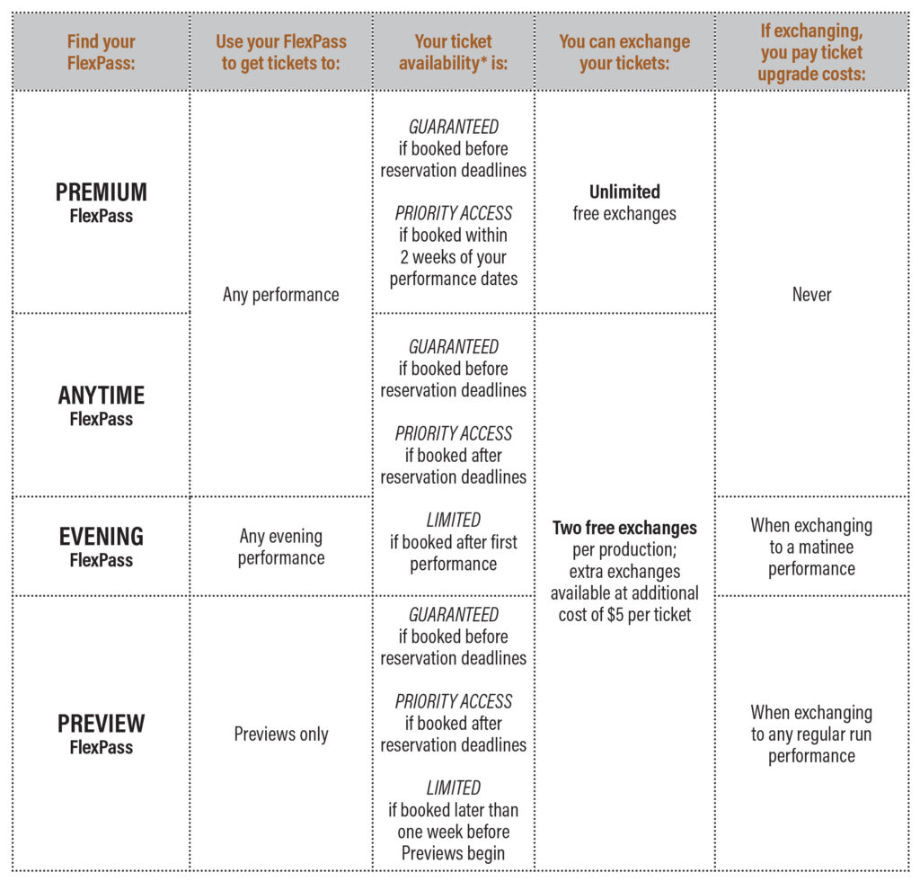 Guaranteed means that TimeLine guarantees you a ticket to see the production but does not guarantee availability of first-choice date. Ticket availability becomes progressively more limited after reservation deadlines and during the course of each production run. While we will always make every effort to accommodate your first choice dates, we encourage our FlexPass subscribers to have second- and third-choice dates available when booking reservations.