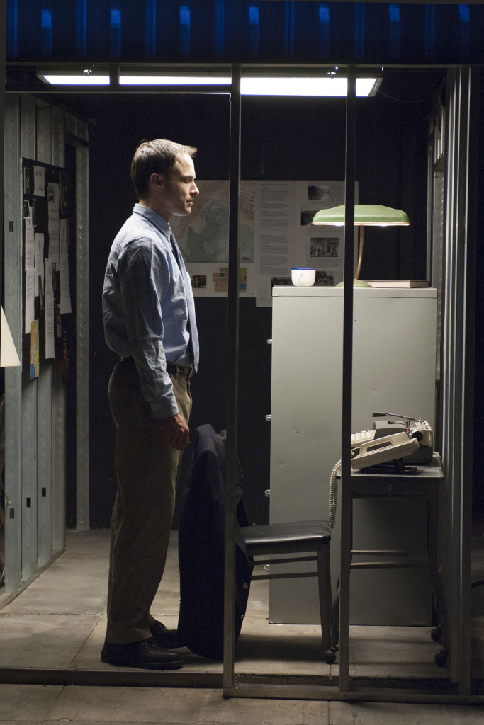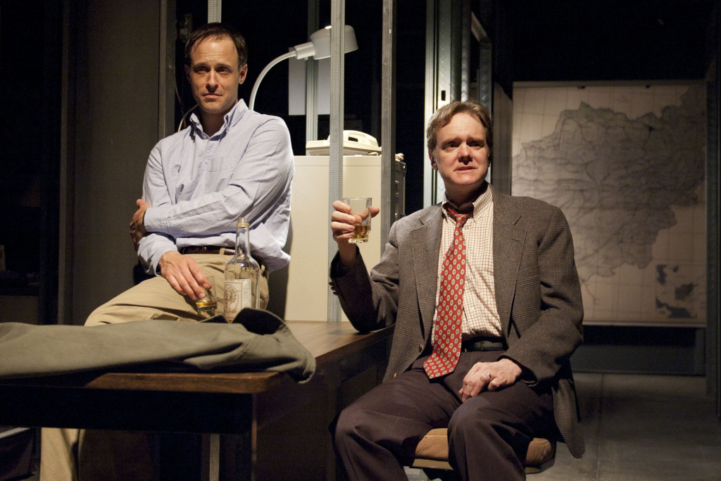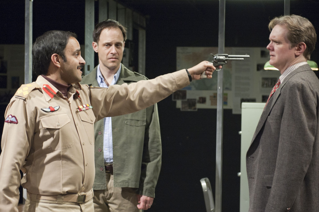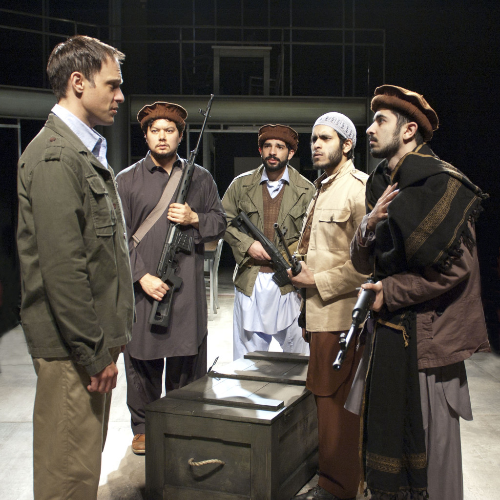 As the CIA's Walter Barnes (David Parkes) and James Warnock (Timothy Edward Kane), as well as a Congressional staffer (Emily Ariel Rogers) and others, listen in, Senator Jefferson Birch (Craig Spidle) confronts Abdullah Khan (Kareem Bandealy) about why the U.S. should send support to Afghanistan.
